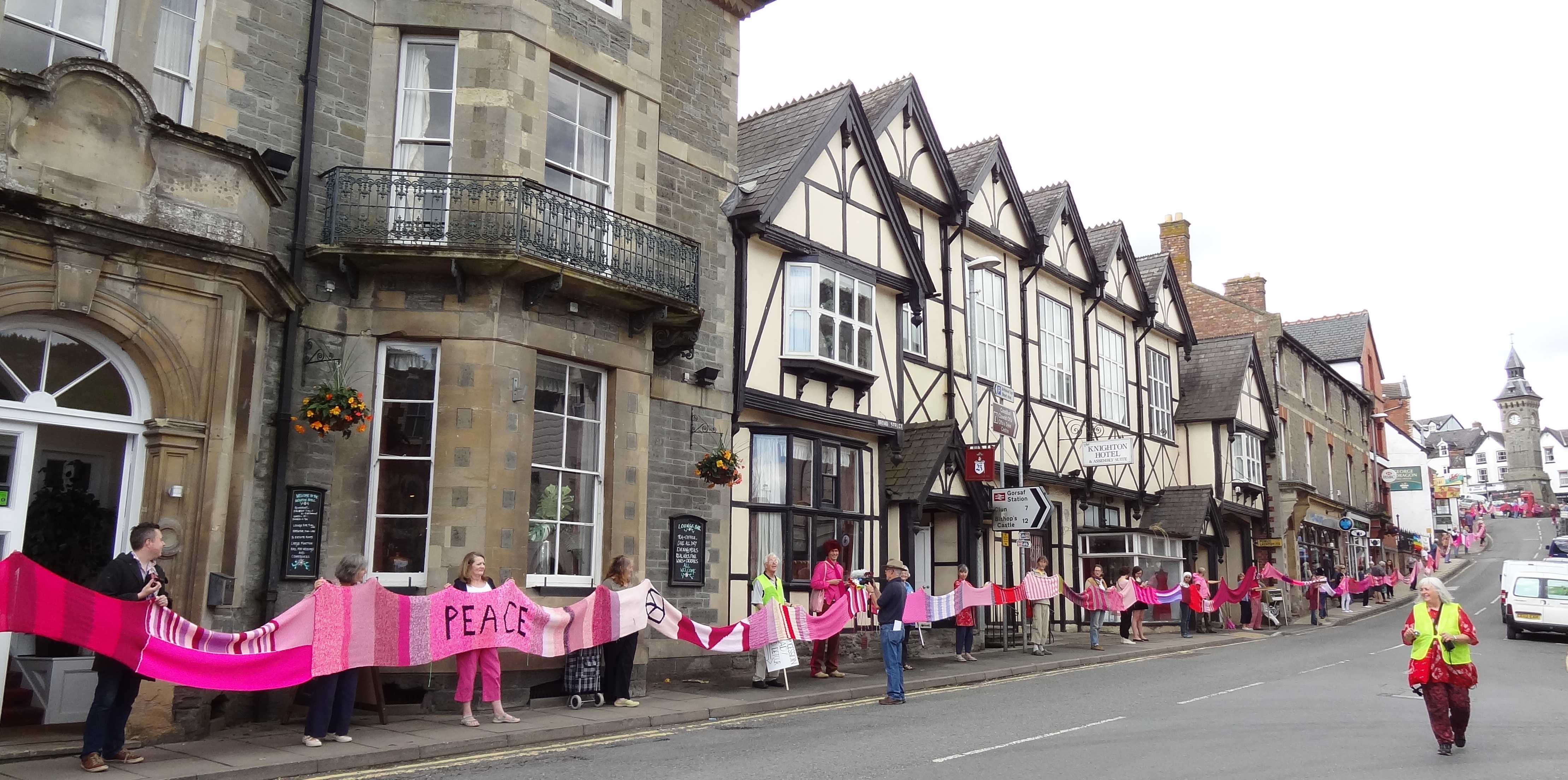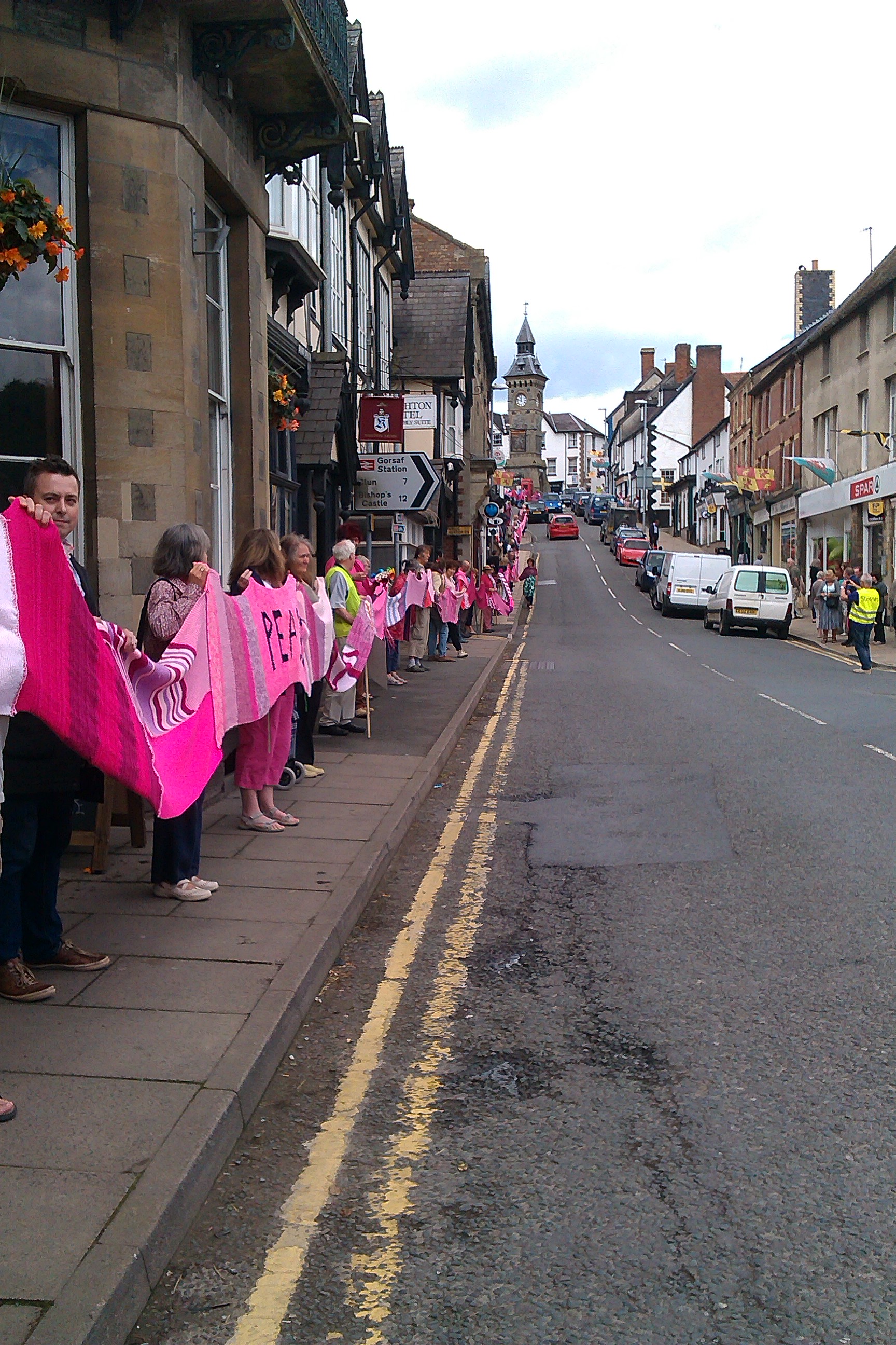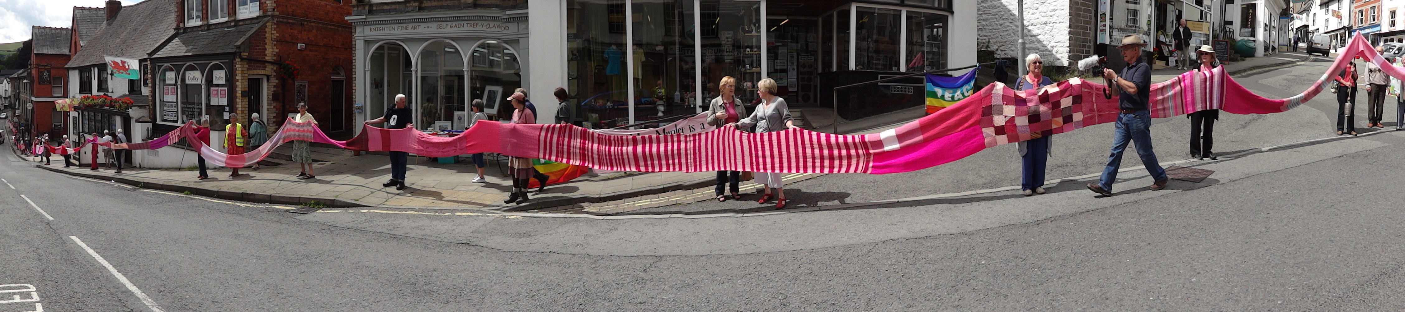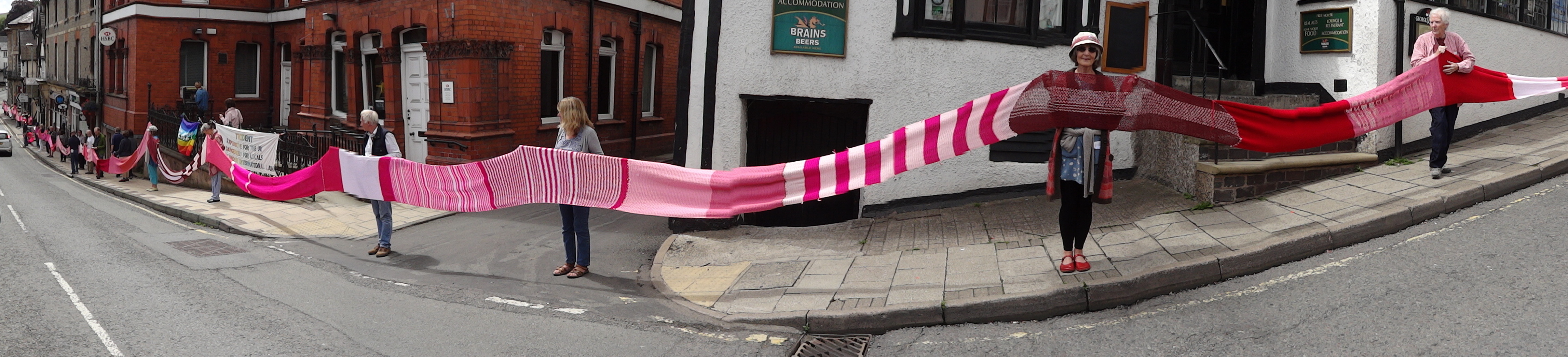Over sixty people helped roll out the Knighton section of the Wool Against Weapons’ pink scarf which is destined to link up with other sections from all around the UK & the wider world on 9th August to link the UK’s nuclear weapons factories, AWE Aldermaston and AWE Burghfield.