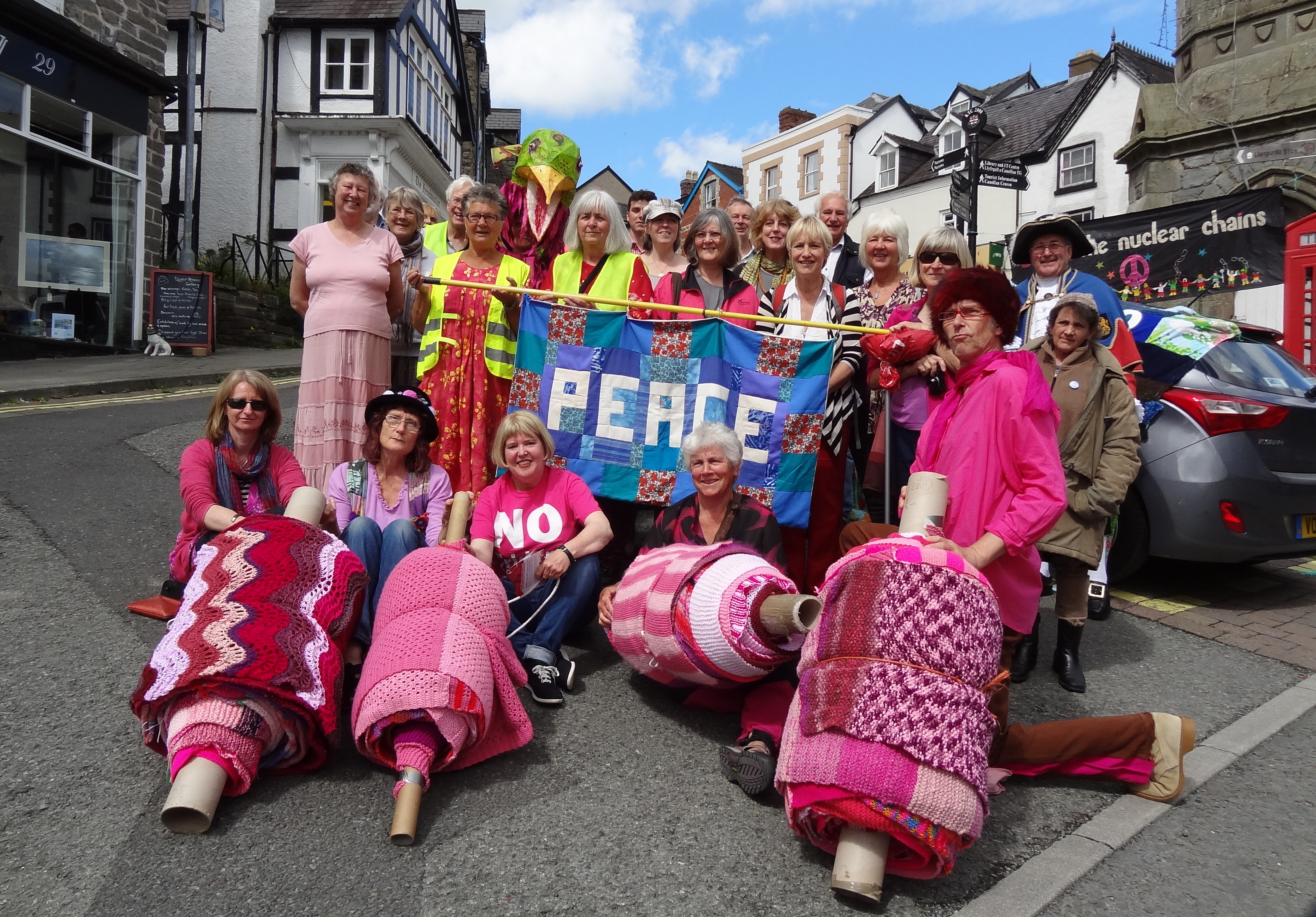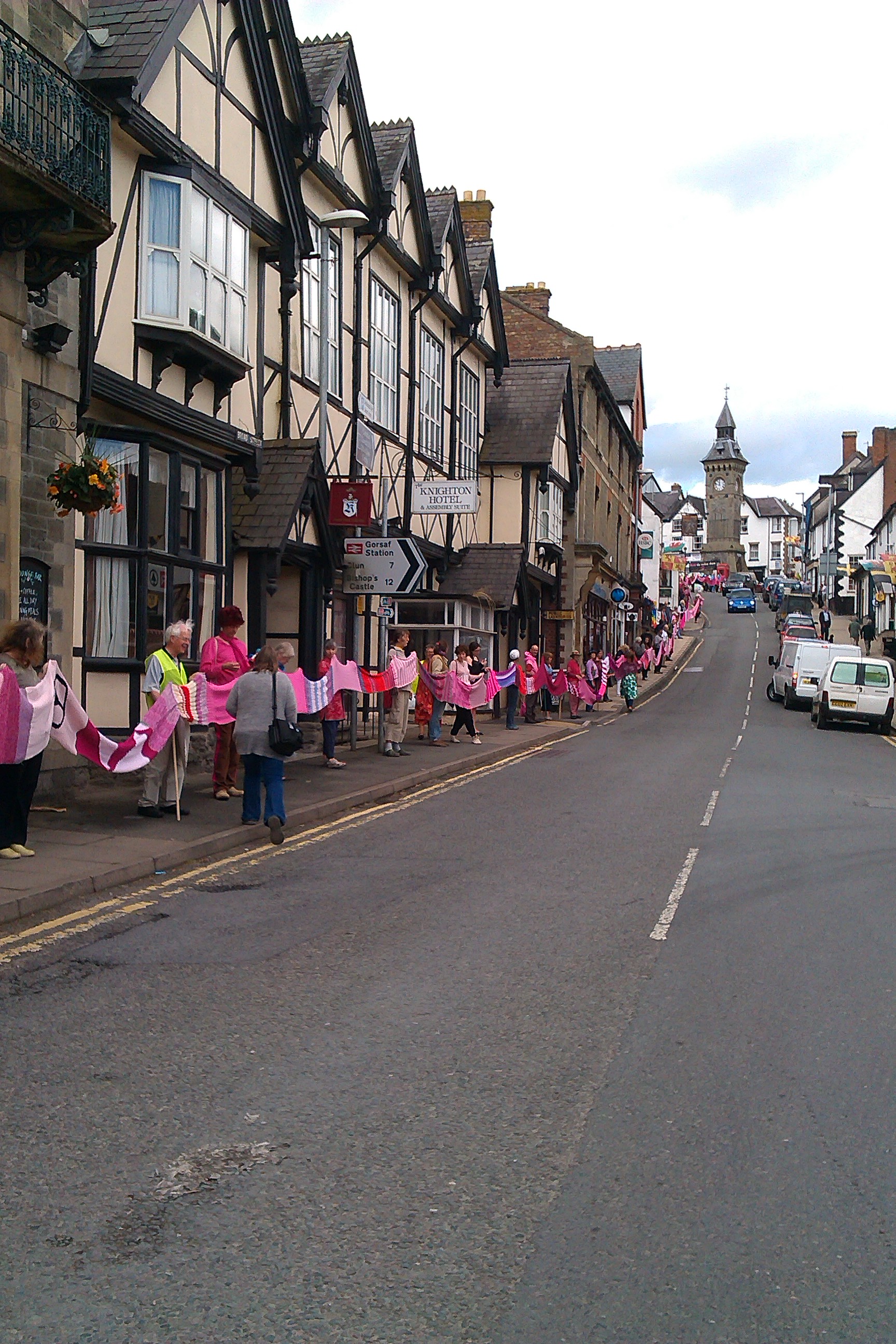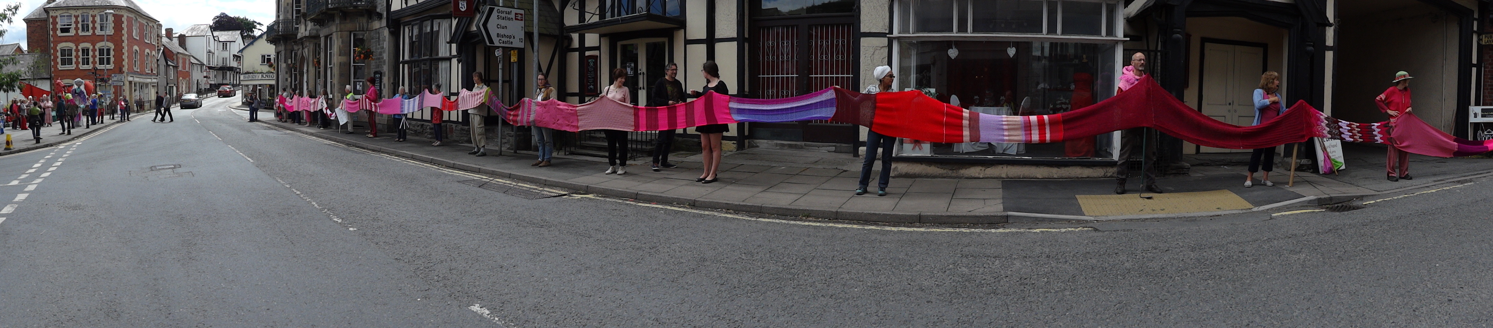 Over sixty people helped roll out the Knighton section of the Wool Against Weapons’ pink scarf which is destined to link up with other sections from all around the UK & the wider world on 9th August to link the UK’s nuclear weapons factories, AWE Aldermaston and AWE Burghfield.