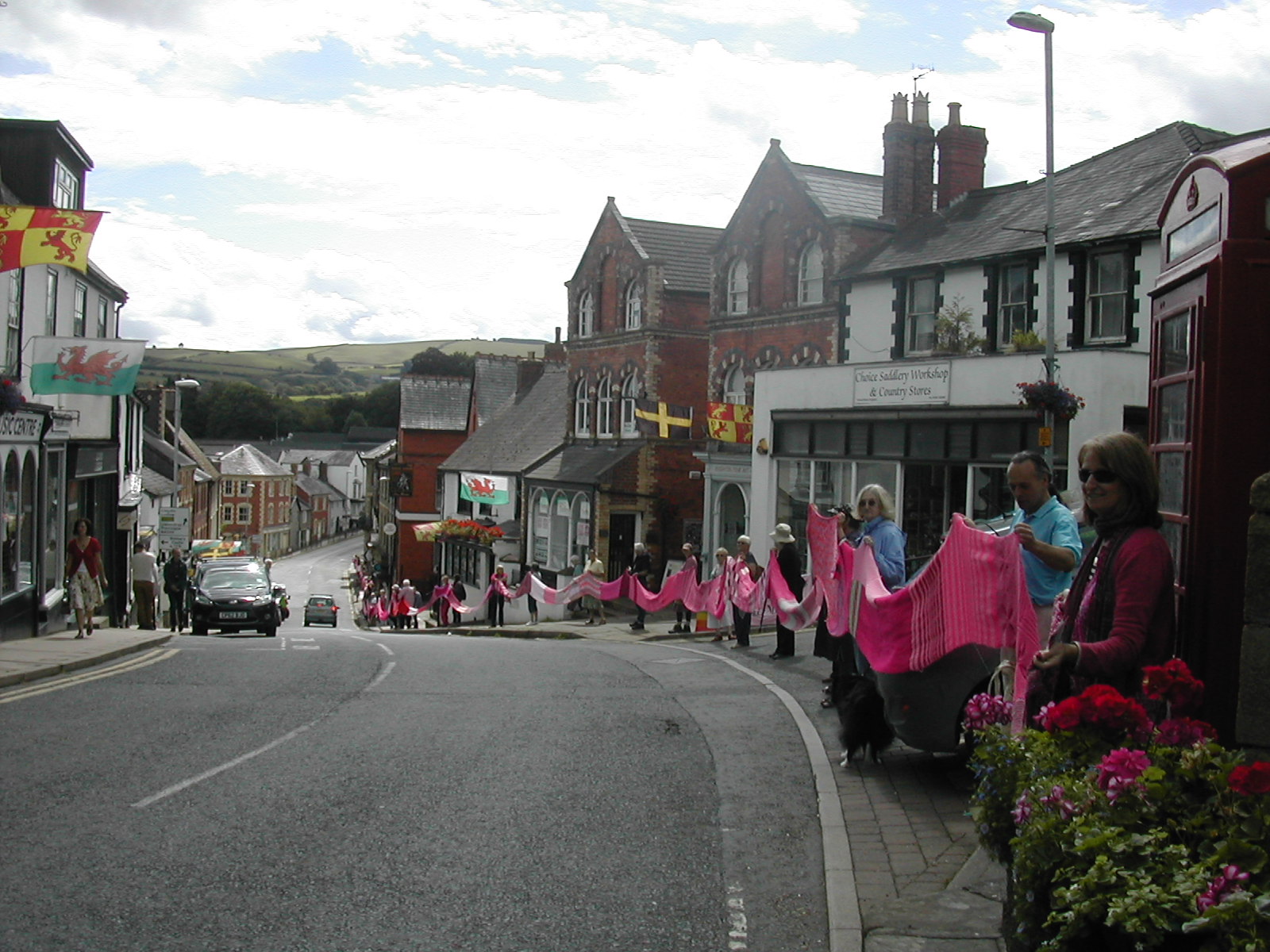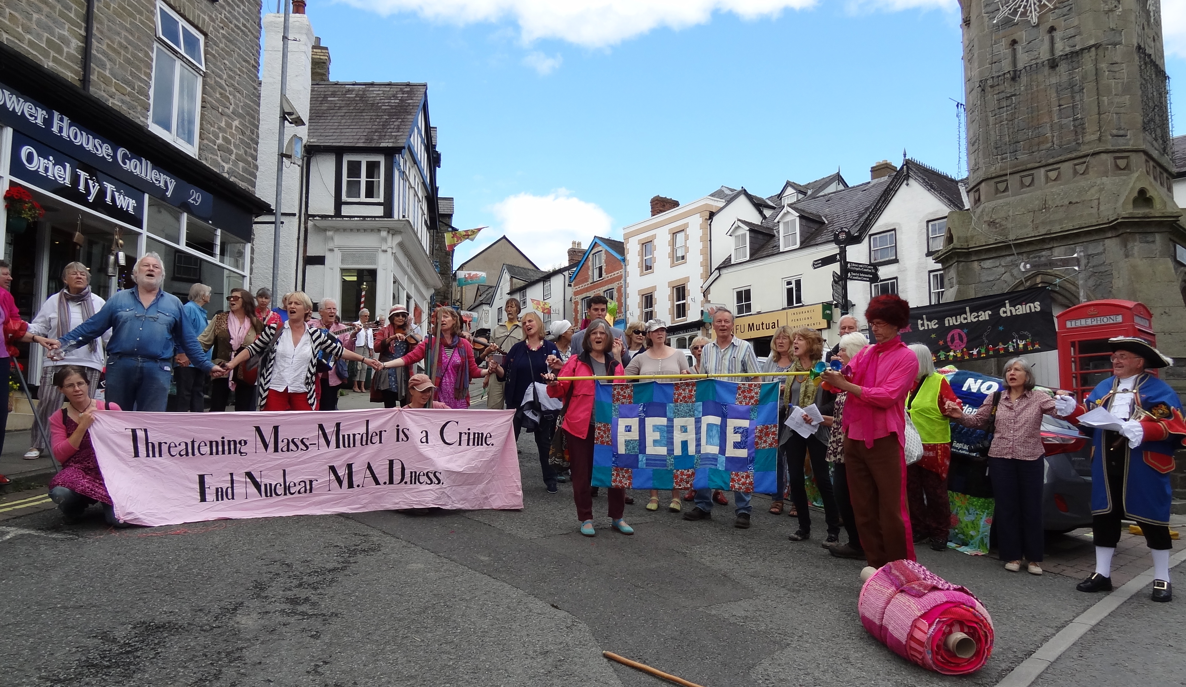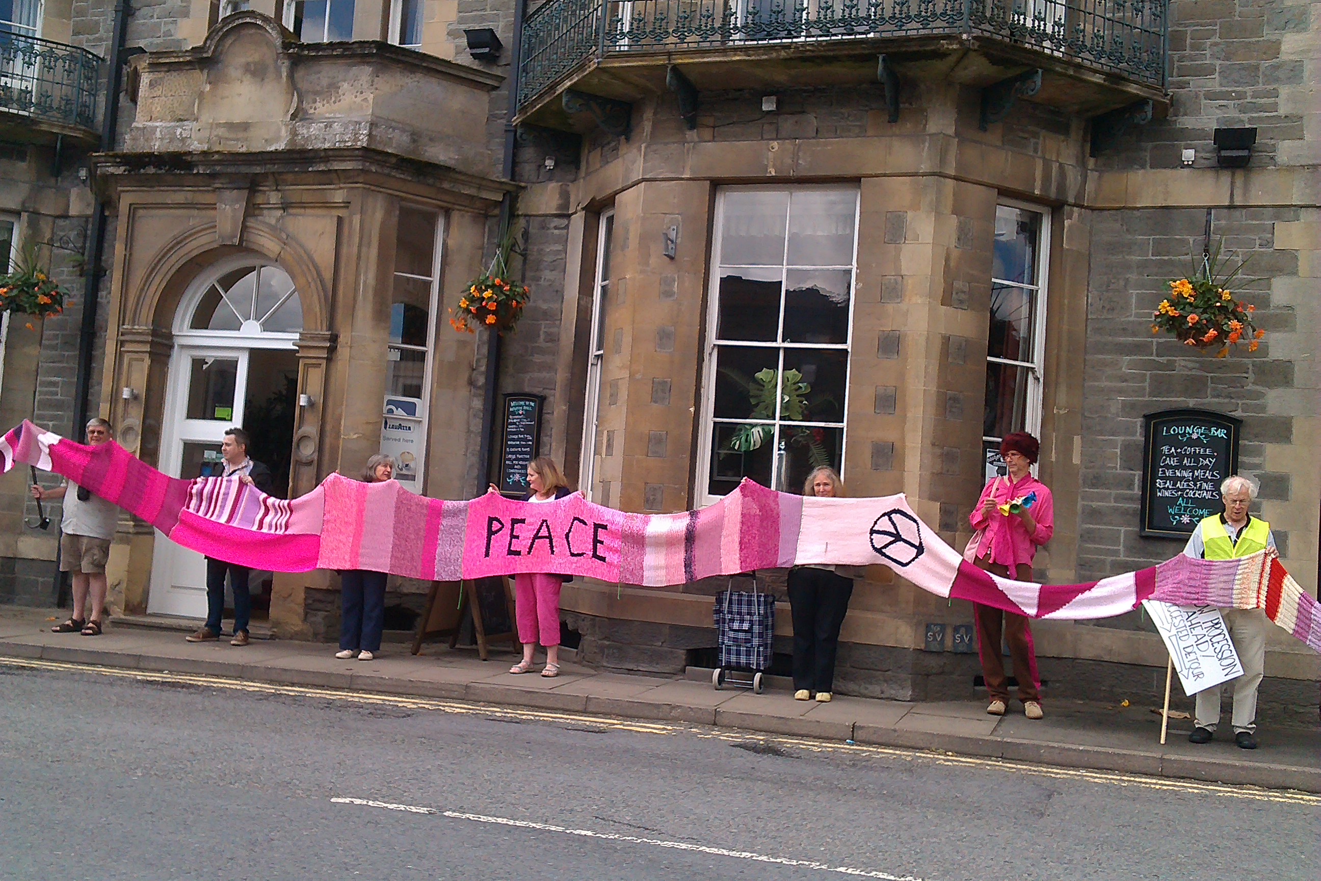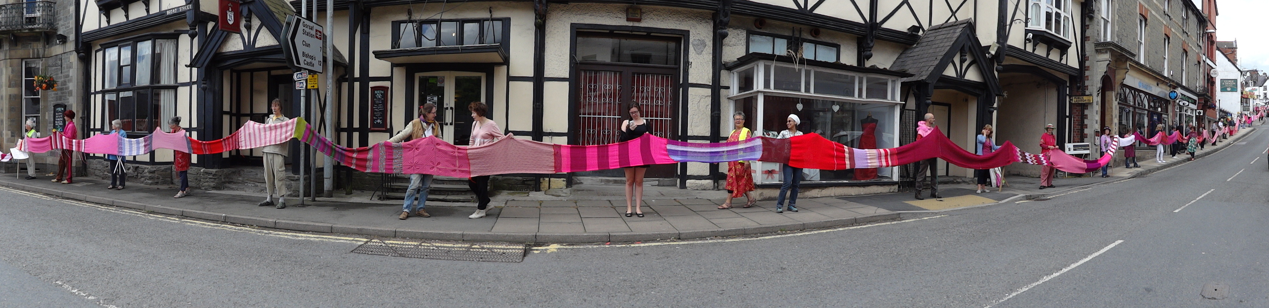 Over sixty people helped roll out the Knighton section of the Wool Against Weapons’ pink scarf which is destined to link up with other sections from all around the UK & the wider world on 9th August to link the UK’s nuclear weapons factories, AWE Aldermaston and AWE Burghfield.