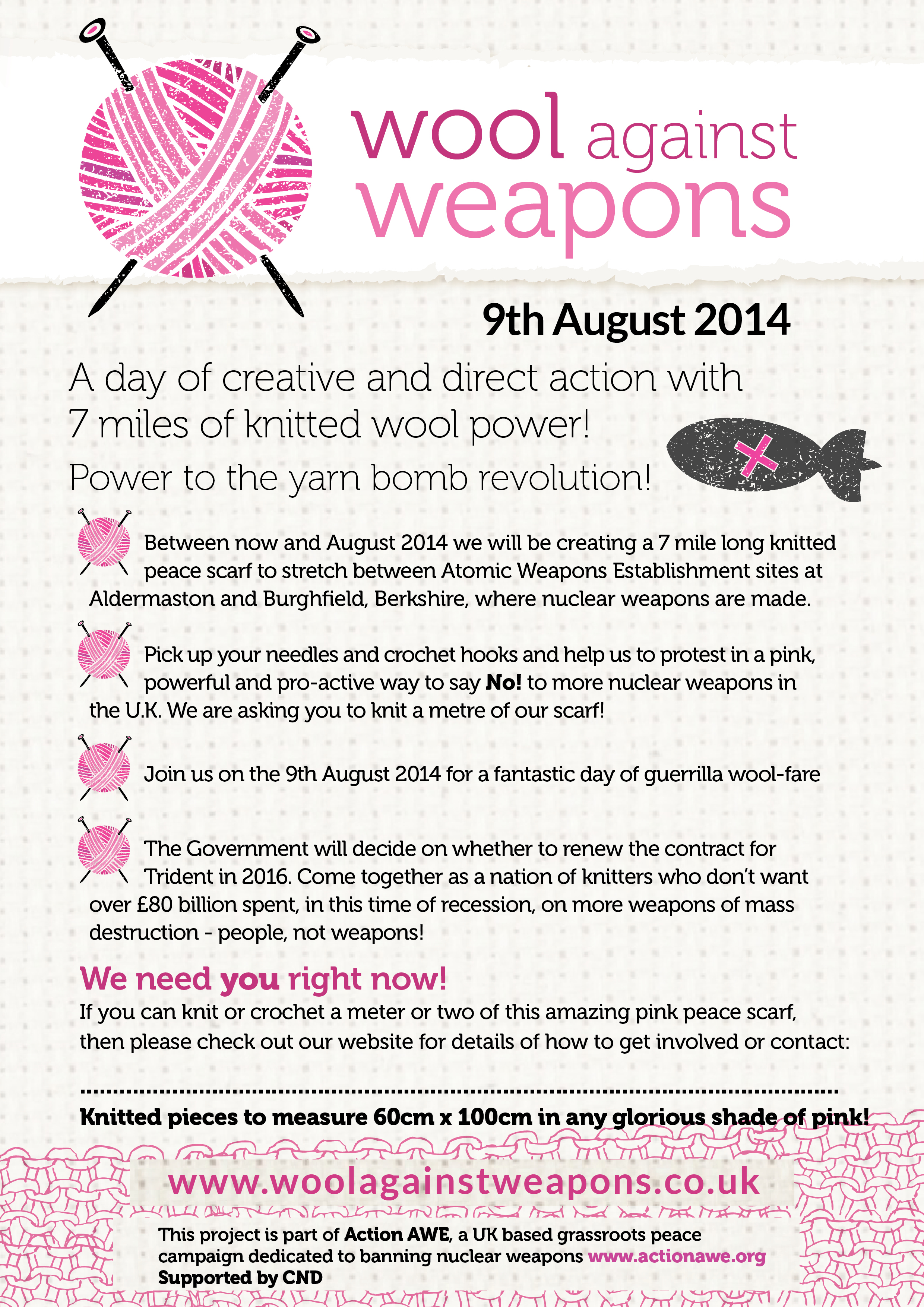 Wool Against Weapons poster for 9th August 2014 event - English & German versions